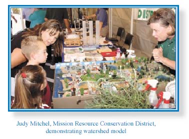 Judy Mitchel, Mission Resource Conservation District, demonstrating watershed model In addition to the materials developed by District staff, visitors were able to view displays and talk with representatives from the Metropolitan Water District (MWD), San Diego County Water Authority, and the Mission Resource Conservation District. MWD provided information on the water supply and recreational benefits of the Diamond Valley Reservoir in Hemet, California, the Authority had a display promoting residential conservation through low water use plants, the Mission Resource Conservation District had information on agricultural and landscape water use efficiency as well as a display on watershed protection, and Master Gardeners were present to answer residents' questions on home gardening and landscaping.