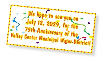 We hope to see you on July 12, 2029, for the 75th Anniversary of the Valley Center Municipal Water District Ceremonies began at 2:00 pm. with an adjourned regular meeting of the Board of Directors, where the District received commemorative resolutions and proclamations from representatives of Senator Dennis Hollingsworth, Assemblyman Ray Haynes, Congressmen Darrell Issa and Supervisor Bill Horn. The Board then adopted its own resolution commemorating the first 50 years of existence for the Valley Center Municipal Water District.